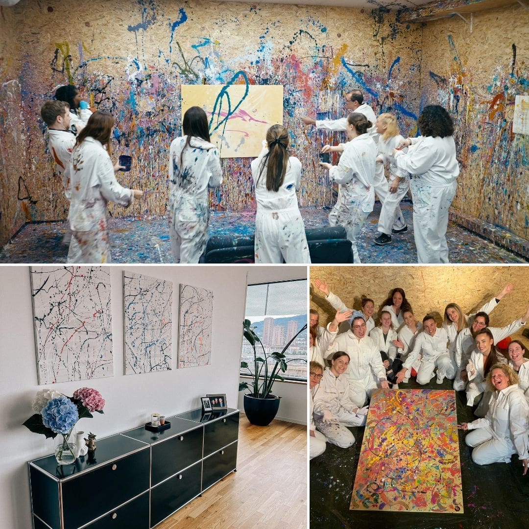 We also offer Action Painting Workshops in a completely private setting just for your group. Please use the following link to fill out the non-binding form for an appointment request. We will contact you shortly.Our offering for teams can be customized (duration, included materials) and starts at 75 CHF per person. For private groups we have a total minimum revenue of 800 CHF. Additional team artworks or drinks can also count towards this minimum. Fill out the quote form via the button below to learn more.