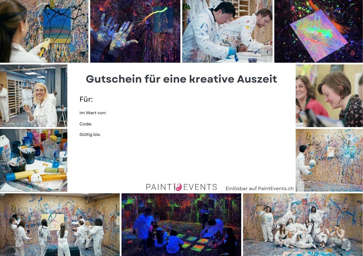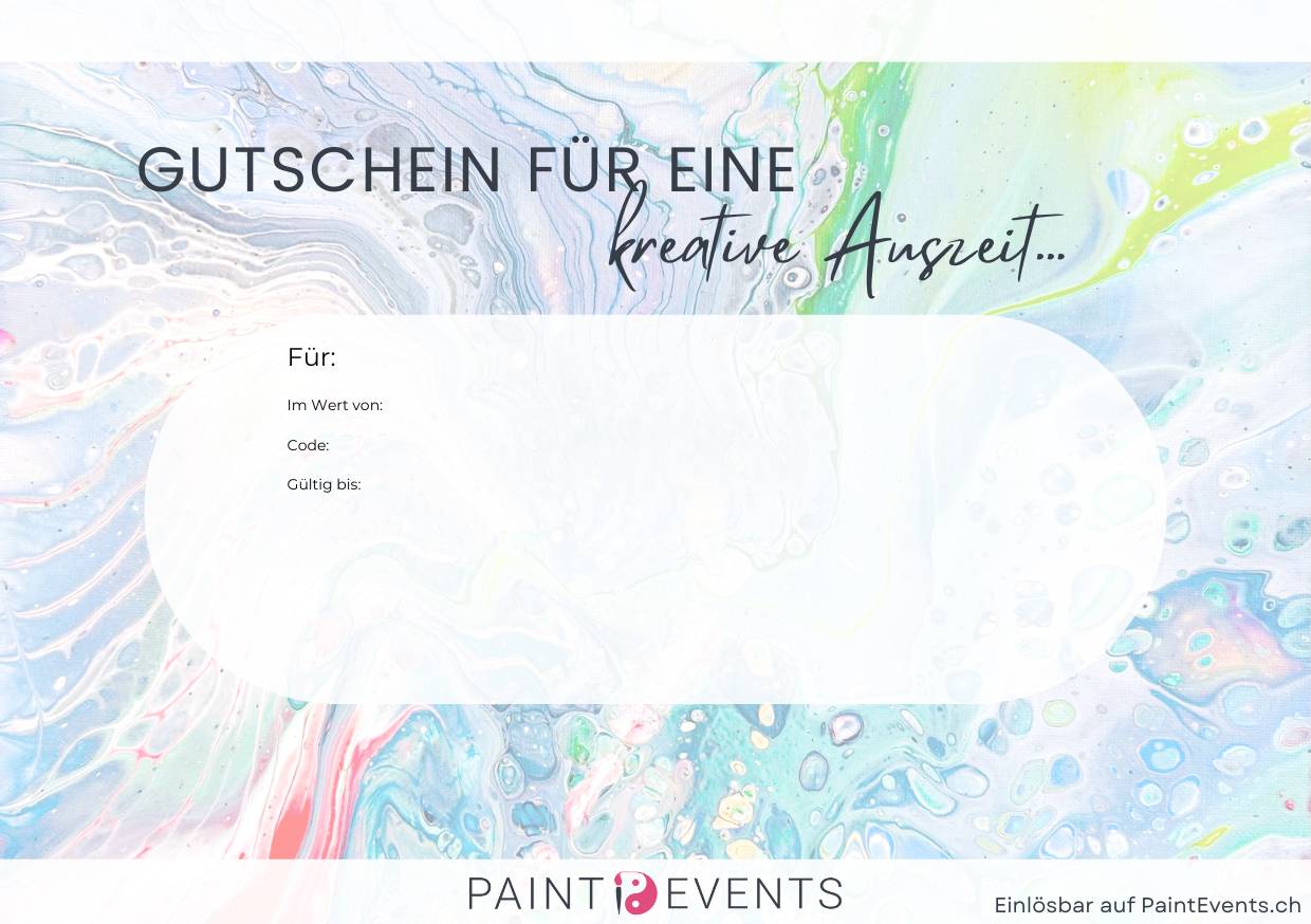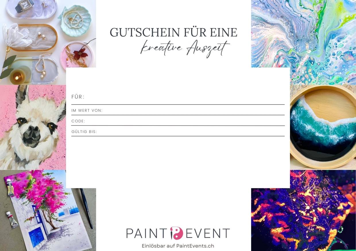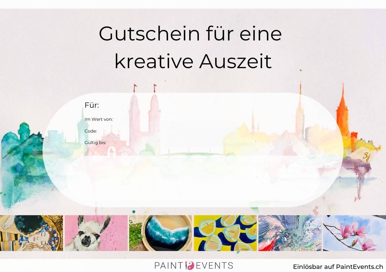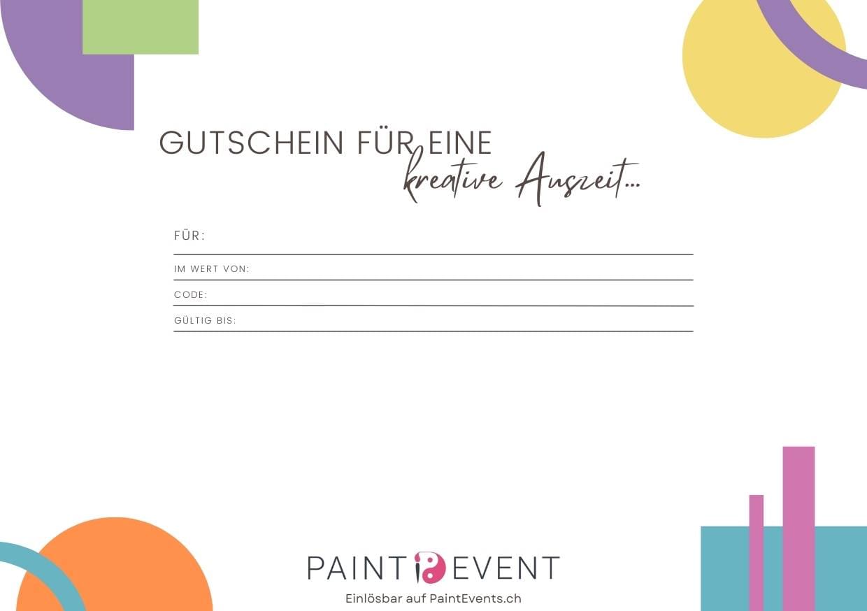 - Betrag nicht auf dem Gutschein anzeigen? Melde dich nach dem Kauf kurz bei uns (info@paintevents.ch). Wir können Dir ein angepasstes PDF ohne Betrag senden.