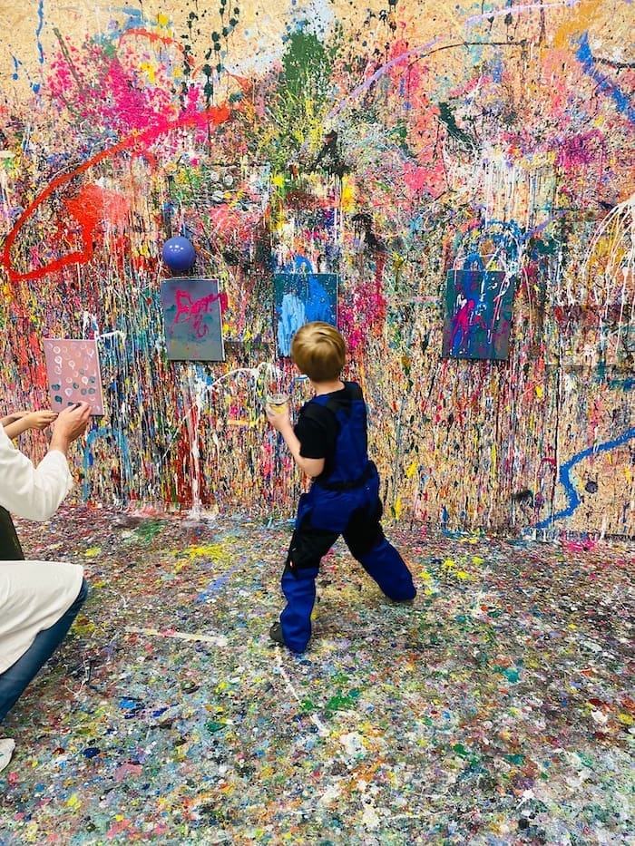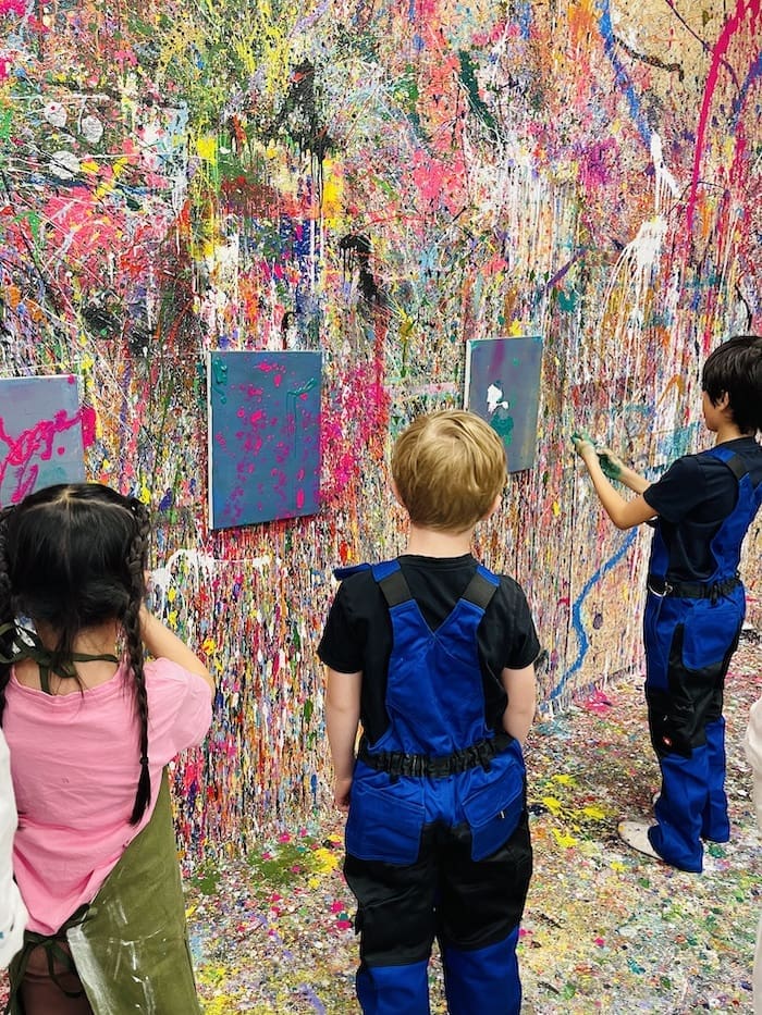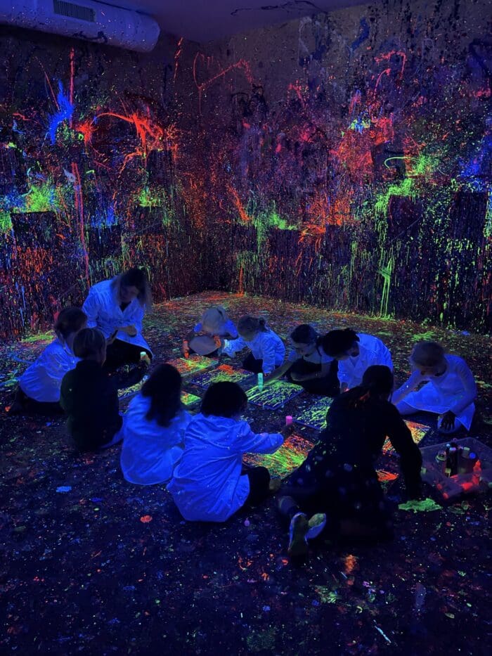 We are always thinking: why do children enjoy a good messy painting experience so much? We think that it is because this process allows them to express themselves in a free way, to communicate their emotions and feelings and to explore their talents and specialties. With the Action Painting for Kids, we offer a unique workshop that you won’t find in any classroom. We’ve set up a large area in our new studio specifically for Action Painting, where kids can splash, spray, and swirl with brushes, sponges, and other tools. The focus is on playfully experimenting with colors and shapes without concentrating on the final product. Additionally, we will also turn on the UV light, the kids can experience a vibrant explosion of colors glowing brilliantly in the dark to create stunning, luminous artworks.